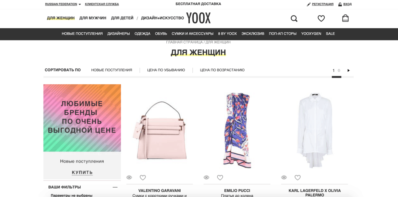 Мультибрендовый онлайн-маркет YOOX позиционирует себя как площадка для моды и дизайнеров. Магазин предоставляет дизайнерскую продукцию, которая поступает к ним напрямую, без посредников, что позволяет поддерживать демократичные цены.